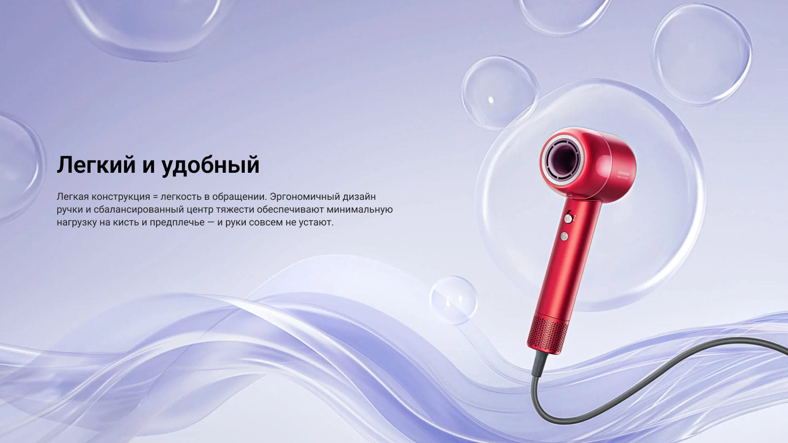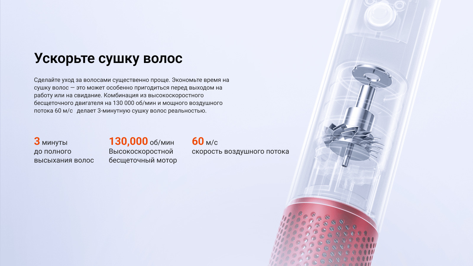 Попрощайтесь с пропущенными из-за включенного фена звонками или сообщениями. Бесщеточный двигатель, аэродинамически сбалансированный вентилятор и система амортизации снижают уровень шума настолько, что вы можете общаться, пока сушите голову.
