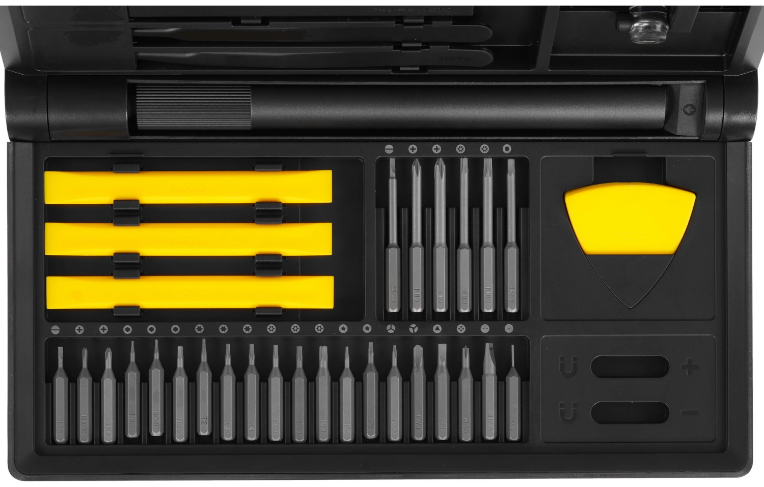 | Комплектация | кабель зарядки, антистатический браслет, магнитный коврик с метром, отвертка + 26 бит (20 коротких и 6 длинных), спунжер-лопатка металлическая, 2 спунжера-лопатки пластиковые, металлическая лопаточка, 2 пинцета разной формы, присоска для снятия экранов и задних крышек, 3 желтые небольшие лопатки для поддевания корпуса, 5 медиаторов для вскрытия корпуса |