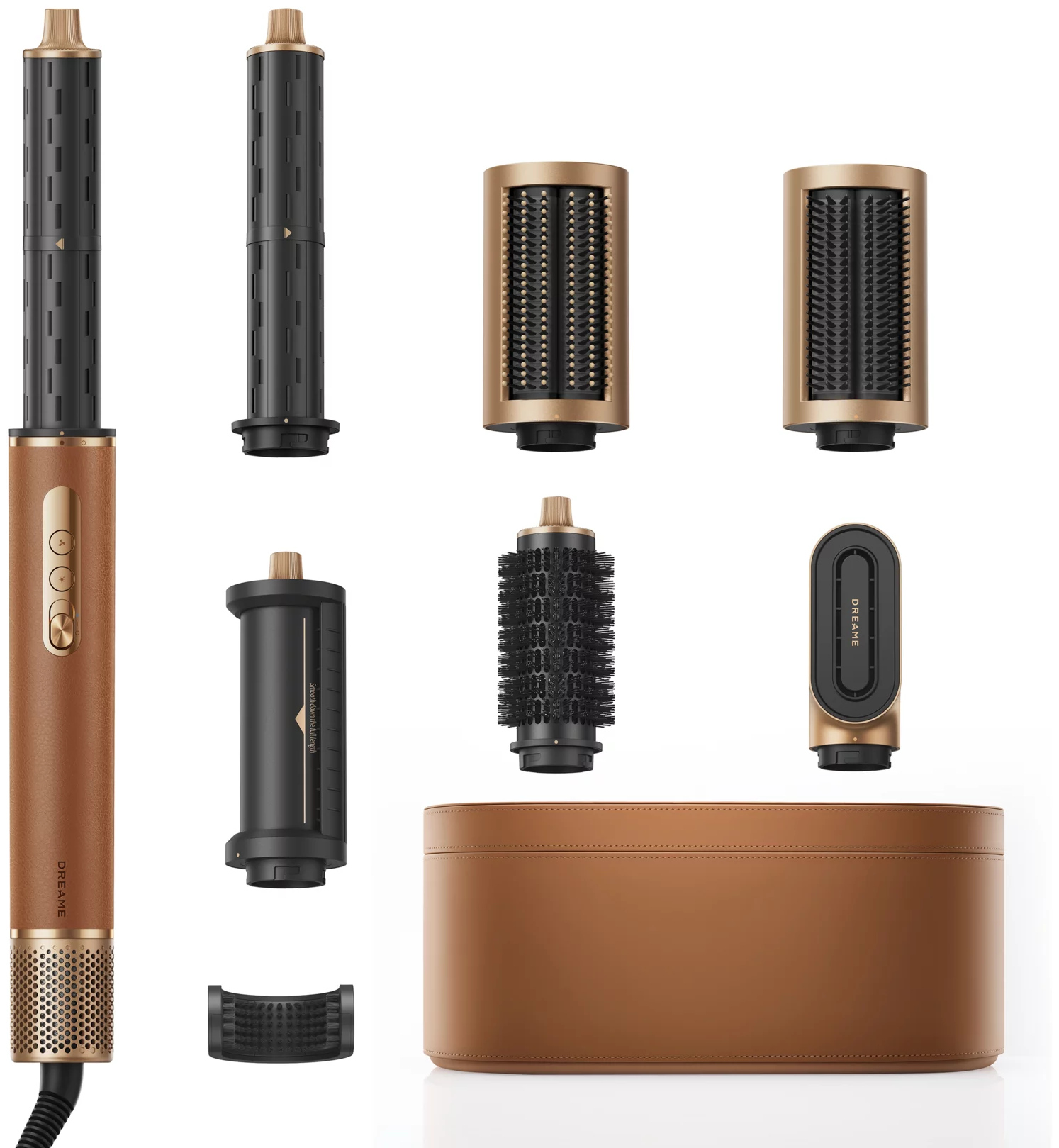 Изделия в комплектенасадка для быстрой сушки, цилиндрическая насадка для завивки x2, мягкая разглаживающая щетка, жесткая разглаживающая щетка, круглая щетка для увеличения объема, насадка для непослушных волос, кейс для хранения
